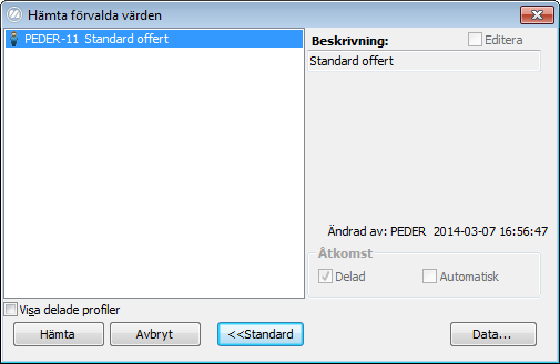Därefter visas fönstret Hämta förvalda värden. Här väljer du profiler med lagrade värden att läsa in till beställningsbilden. Fönstret har två visningslägen och du alternerar mellan dessa med knappen Detaljerad>> och <<Standard.