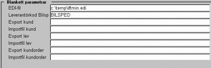 För blanketterna EDI-fraktsedel finns det parametrar för att ange sökväg dit EDI-filen ska skapas, samt företagets leverantörskod för Bilspedition. Dessutom finns några specialparametrar enbart för de som kör EDI i MONITOR för DOS parallellt med EDI i MONITOR för Windows.