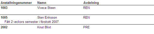 Här visas anställningsnummer, namn samt avdelning som den anställde tillhör. I denna lista går det att välja olika parametrar för hur arbete ska rapporteras och kopplas.