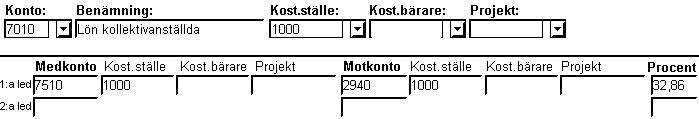 Exemplet ovan visar att konto löner 7010, har kopplats till en automatkontering. Detta innebär att 32.86 % av beloppet på 7010 kommer att medkonteras (debet) på konto 7510, Lagstadgade arbetsgivaravgifter och motkonteras (kredit) på konto 2940, Upplupna sociala avgifter.